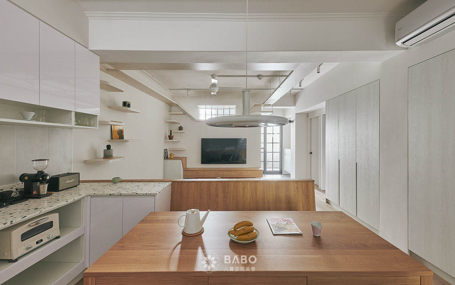 ▲清爽的木質中島遇上溫柔米白,剛剛好的日式簡約感,讓廚房與客廳之間柔和轉場,就像生活慢慢展開的一幅畫。