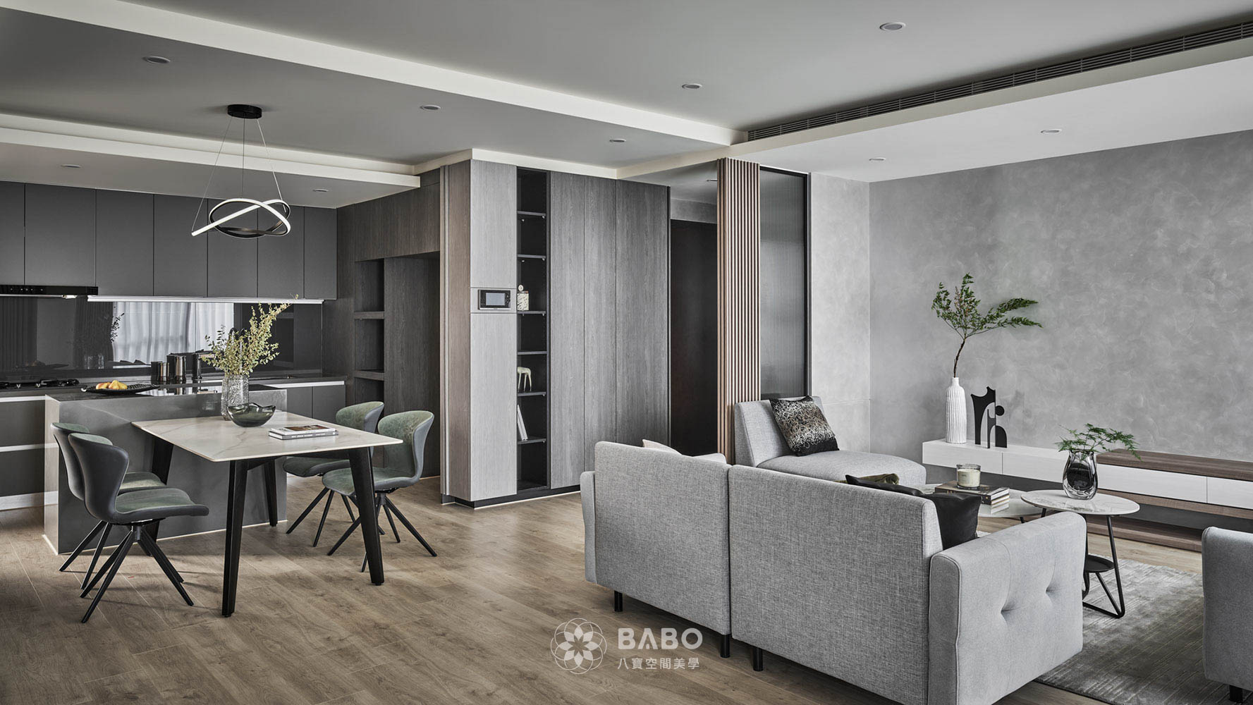 ▲霧灰櫃體、石紋檯面與微光金屬配件在空間中相互呼應,創造出視覺上的層次與深度,即便是開放式設計,也能透過色彩與材質的呼應,自然融入客餐廳,維持整體調性一致。