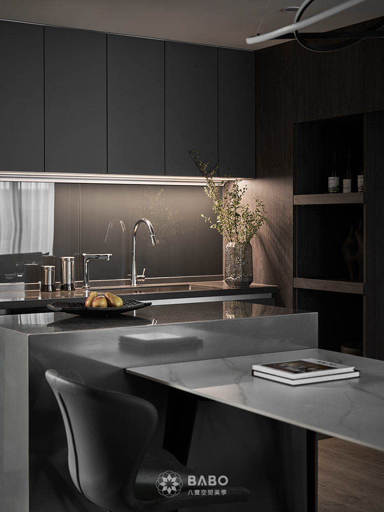 ▲半開放式的廚房設計,融合了優雅線條與實用機能,讓料理空間既有質感又不失生活氣息,更營造出低調奢華的視覺效果,整體空間在光線映照下顯得明亮而通透。