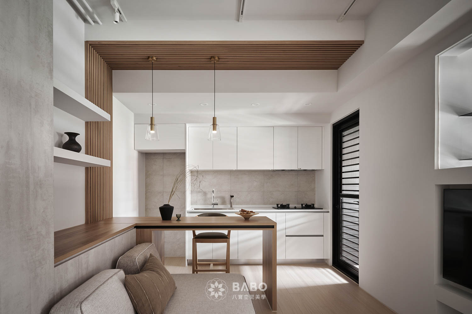 ▲大面落地百頁窗引入充足自然光,讓整個空間顯得更加敞亮通透,光影隨著百頁角度變化而流動,在屋內勾勒出柔和又富層次的光感。