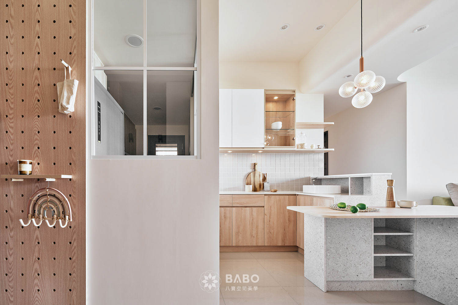 ▲清爽的木質中島遇上溫柔米白,剛剛好的日式簡約感,讓廚房與客廳之間柔和轉場,就像生活慢慢展開的一幅畫。