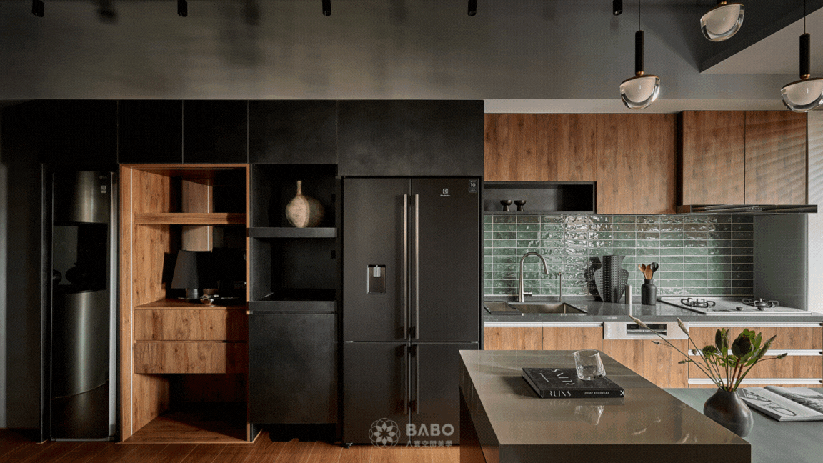 ▲輕工業風格的廚房設計,讓男主人樂於下廚,以綠色磁磚、鐵件元素與原木材質交織出粗獷與細膩並存的視覺張力。